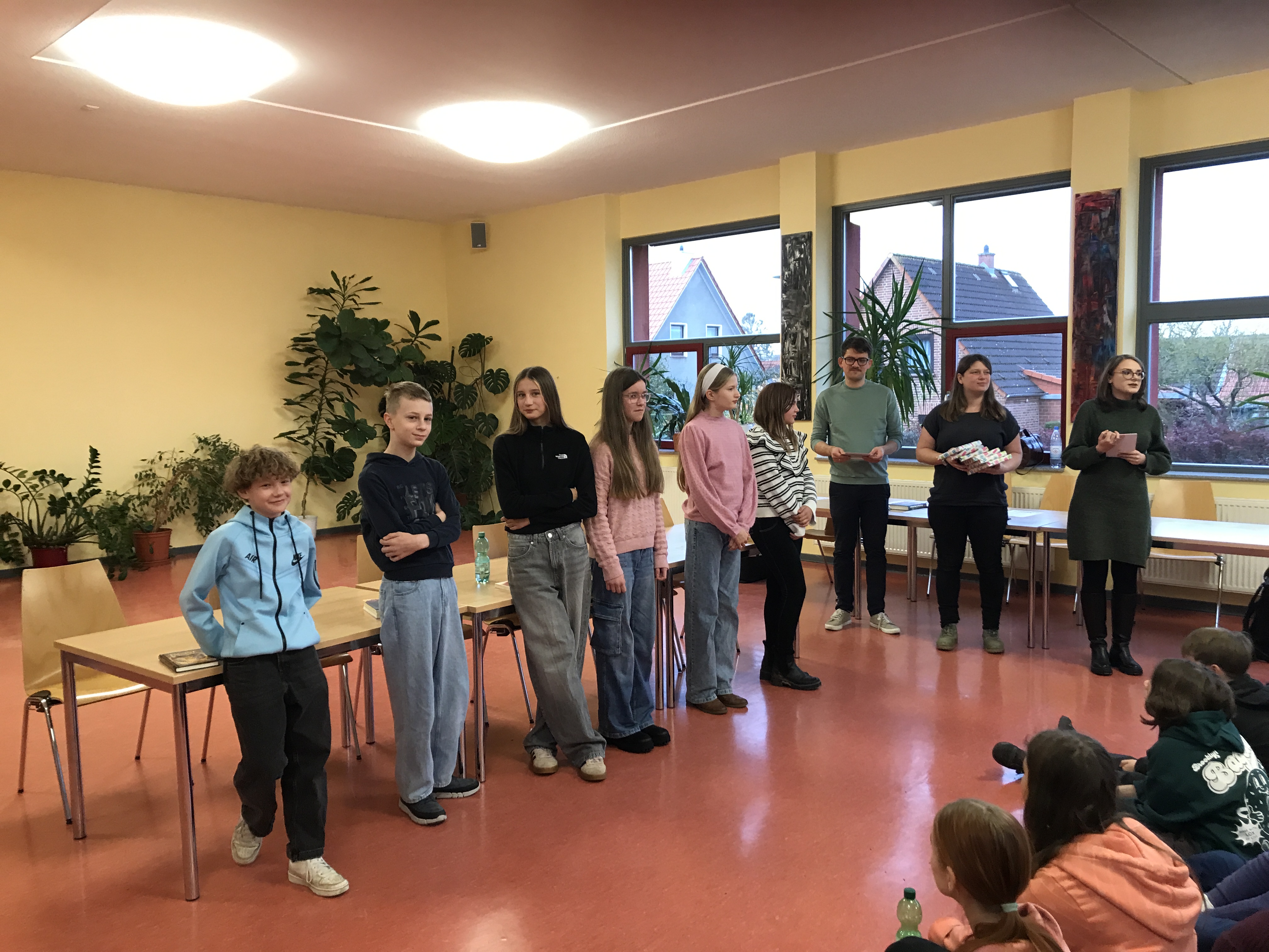 Hierbei traten sechs Schülerinnen und Schüler gegeneinander an, wobei sie vor all ihren Klassenkameradinnen und Klassenkameraden erst ein selbst gewähltes Buch vorstellten und daraus vorlasen.